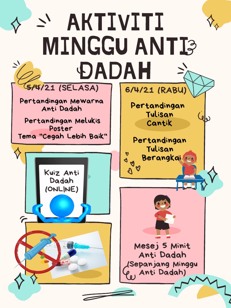 Pameran Ceramah Anti Dadah Pertandingan Poster Mewarna dan Kuiz Pencegahan Anti Dadah Pencegahan merupakan strategi jangka panjang yang bertujuan. Pertandingan mewarna poster ini biasanya hanya untuk kanak-kanak sekolah rendah sekolah kebangsaan. Warnakan dengan warna yang cerah.